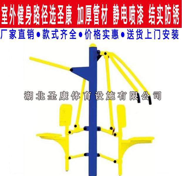 湖北圣康体育【襄阳有限公司15334229288】专业供应室外健身器材游乐设施,襄阳社区健身器材、户外健身器材采用优质的钢材,安全质量高,主要安装于社区、公园、校园、医院、村委会等等休闲地方供人们游玩。室外健身器材种类有:双柱、路径、康乐三大系列。主要;双位浪板、踏步浪板、扭腰踏步器、臂力训练器、三人转腰器、跑步机、双人肩部活动器、联椭圆机、坐位扭腰训练器、连平步机、单人漫步机、划船器、联漫步机、三联漫步机、四位蹬力器、多功能训练器、蹬力训练器、吊桩、提拉训练器、太空休闲椅、漫步腰旋组合、压腿架、上肢牵引训练器、腹肌训练器、骑马器、太较推手、三位压腿器、双人坐蹬、扭腰摩背器、棋盘桌、伸腰架等,款式众多,型号齐全,价格*,品质有**,免费送货安装。